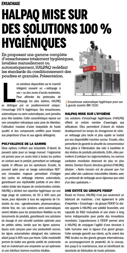 With increasingly stringent health protocols, “dry cleaning” is no longer enough. At HALPAQ, we are redefining industry standards with a unique promise: 100% hygienic bagging. From stainless steel design with no retention areas to automatic CIP (Clean In Place) washing, discover how our solutions, capable of reaching 600 bags per hour, combine record productivity with rigour. Delve into the article in the Journal du vrac dedicated to our expertise.